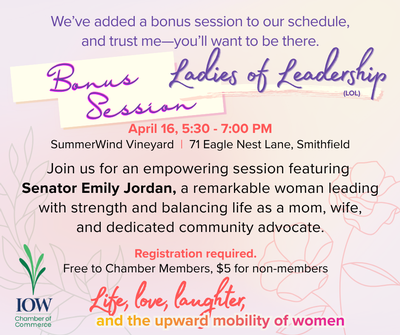 We’ve added a bonus session to our schedule, and trust me—you’ll want to be there Bonus Session—Ladies of Leadership Meeting! Join us for an empowering session featuring Senator Emily Jordan, a remarkable woman leading with strength and balancing life as a mom, wife, and dedicated community advocate. This event is open to ladies in Smithfield, Windsor, the Isle of Wight, and the surrounding areas. Whether you are looking to make new connections, get involved in the community, explore opportunities, or just enjoy an evening out, LOL is the group for you!